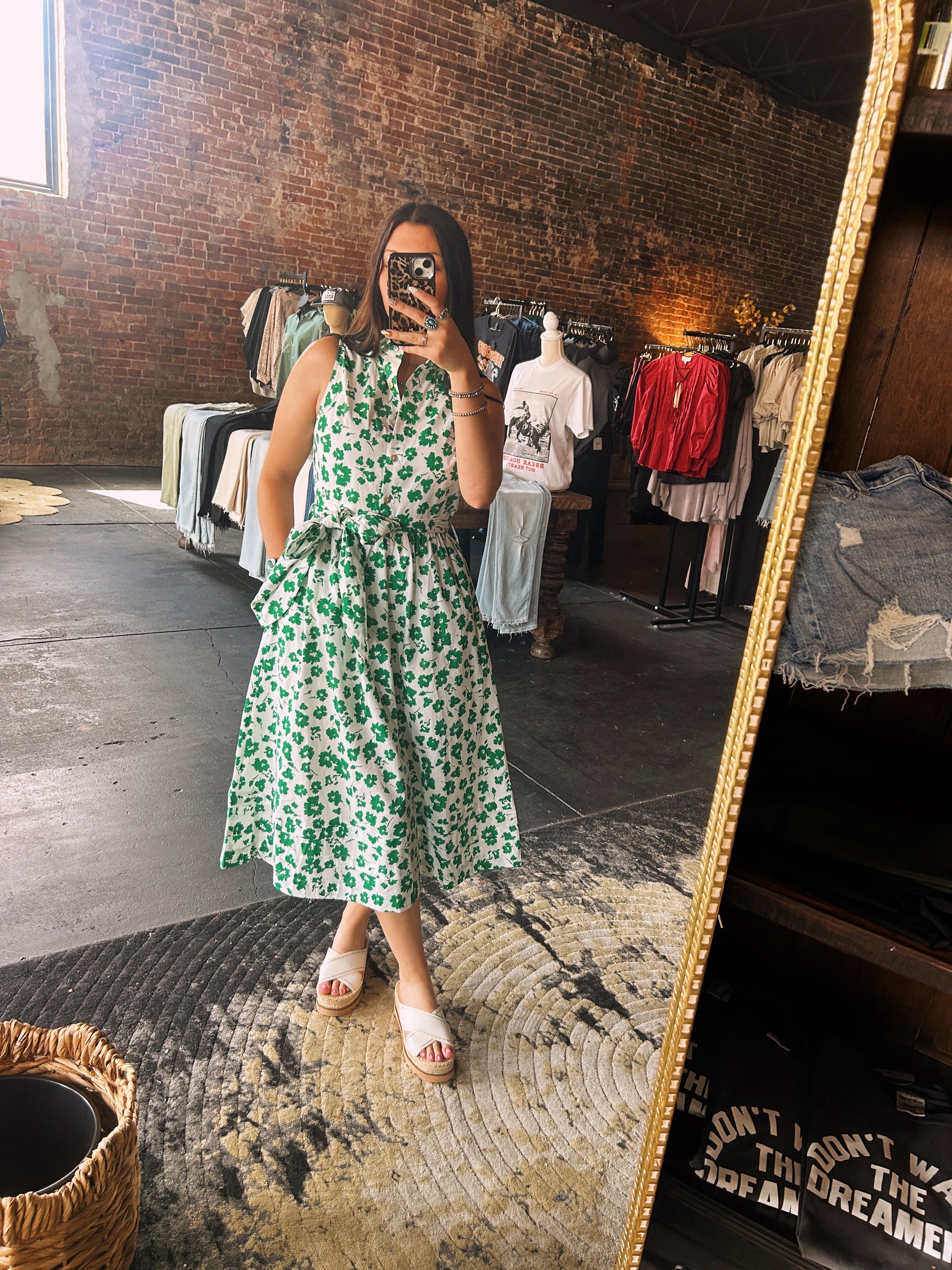 Collared floral maxi dress. Comfy, flowy dress that is perfect for summer! Buttons down the front, and has a belt.