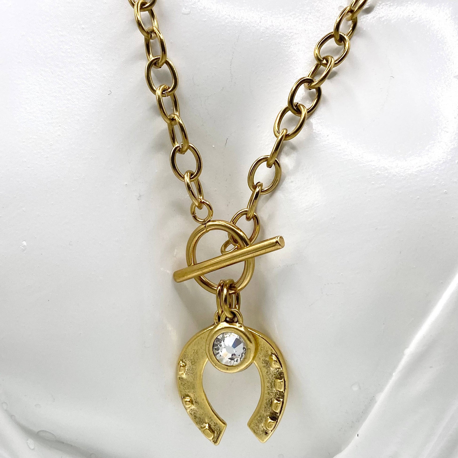 Bring a touch of timeless luck and elegance to your collection with this hand casted golden horseshoe necklace. The bold stainless steel chain and toggle clasp add a modern edge, while the horseshoe – a universal symbol of good fortune – gives it a meaningful, stylish finish.